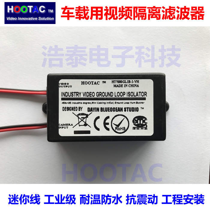 浩泰电子专业定制产品 内置铍镆合金材料优质隔离变压器,高灵敏还原低照度视频信号,同时具有中长距离共模噪声如横纹和雪花点过滤功能,耐温器件和优质灌封工艺,可靠工作于-45至+85度特种车辆用户专用防震型车载视频环境, 采用可接驳于固定接线镙丝端子耐温耐寒的迷你线输入输出电缆, 用于消除图像因共地或周围超强电磁环境造成的横纹和雪花干扰。本产品兼容国际CE/FCC/ROHS认证标准