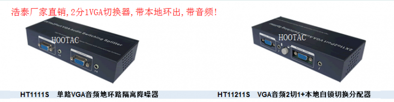 HT1111S单路VGA音频地环路隔离滤波降噪器(具地环路隔离功能),HT1112S 1分2口VGA音频分配器(具地环路隔离功能),HT1121S 2切1口VGA音频切换器(具远端信号地环路隔离功能),HT1122S 2切2口分配VGA音频切换分配器(具远端信号地环路隔离功能),HT11120S 1切2口切换VGA音频环出+静默型切换器(具本地端口调试显示,远端信息保密静默),HT11211S 2切1+1口切换自锁型VGA音频切换自锁分配(输出本地端口自锁,第二端口2切1选择输出)。