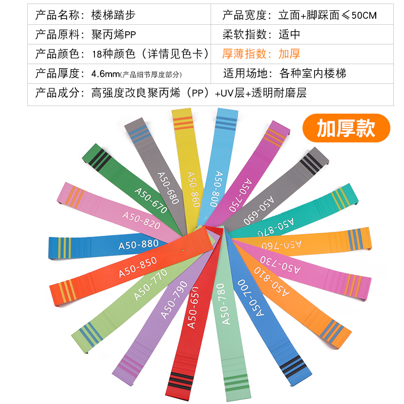 整体加厚塑胶PVC防滑耐磨楼梯专用踏步的优点:防滑、防水、耐磨、静音、安全环保、施工简便、易清洁。用处规模广,如幼儿园、学校、旧楼改造、办公楼、厂房车间、养老院、病院等等,对于总体楼梯的处理;任何楼梯基面均可以铺装;PVC楼梯踏步多种色彩,红色、灰色、绿色、浅棕色、卡其色,蓝色,黑色等。河北华盛体育用品有限公司生产的PVC楼梯踏步采用原生料生产,无任何气味,给您创造一个安心的舒适环境。工厂直营,大量库存,品质保证,发货迅速,样式齐全!楼梯的立面和平面不大于50cm都可以使用。