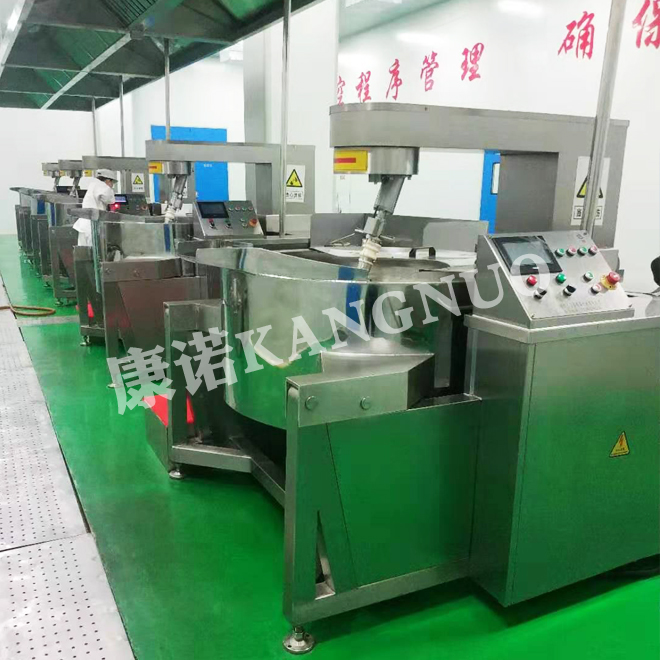 行星搅拌炒锅,锅体采用日本技术一次冲压成型,与普通锅体相比,平整度高,避免炒制糊锅。加热方式可采用蒸汽、液化气、天然气等加热形式,搅拌方式为特殊的倾斜式传动,确保行星式搅拌器与锅体充分接触,实现传动公转与自转的不整数传动比,使锅内无搅拌死角。先进的传动与密封结构,使传动部分与锅内洁净、卫生。采用变频调速动力,运行更平稳。另本机采用液压升降,翻锅运料,免拆装搅拌器,节省人力,降低劳动强度,是性能优良的食品加工设备。