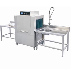 本机通过不锈钢水泵将水从水槽中抽出加压并循环使用,水槽内的水温由温控器控制在55℃(50~60℃)。本机以洗涤和漂洗循环方式运作。在洗涤过程中洗涤篮固定不动,上下洗涤臂由洗涤水推动旋转。这种方式的优点在于洗涤臂可从各个角度对碗、碟进行清洗,不存在死角,保证了洗涤质量。洗涤水槽中需要加入洗盘机专用洗涤剂,洗涤剂的主要作用是除去碗碟上的油腻及残渣,并使这些油腻和残渣悬浮在洗涤水槽中。洗涤程序完毕后是漂洗程序,漂洗臂喷出82℃(80~85℃)的高温净水(洗杯时温度控制为65℃),上一个程序的漂洗水作为下一次洗涤水用,从而保证了洗涤水的清洁性,也节约了用水。漂洗时,用分配器自动加入催干剂,能迅速挥发餐具表面水分,不留痕迹,并起到消毒作用。
