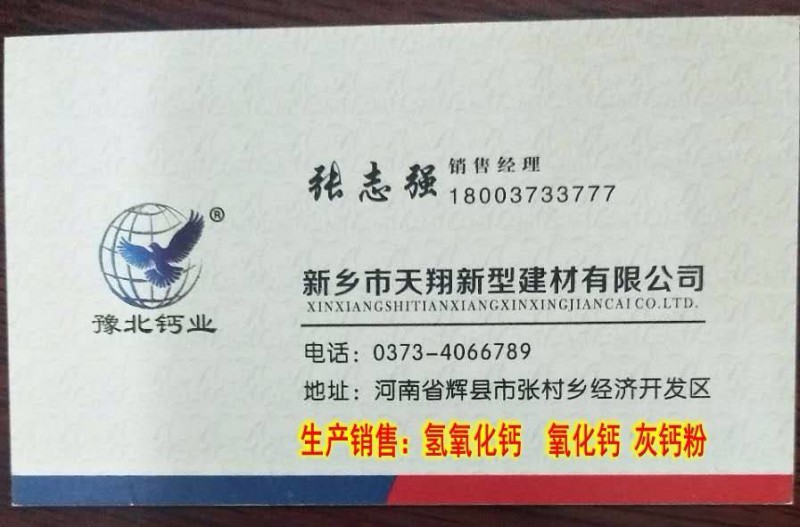 新乡市天翔建材(豫北钙业)有限公司是河南省最大的氧化钙、氢氧化钙(特别是水处理及炉烟脱硫专用系列产品)生产基地。企业成立于二零零六年,为私营中型企业,现有资产总值1500万,占地面积30万平方米,职工58人,各类专业技术人员10余名。采用科学管理方式和引进国内外先进设备技术,研制开发出具有白度好、纯度高、粒径微细等高品质的氧化钙、氢氧化钙系列产品。 在日趋激烈的市场竞争中,新乡市天翔建材(豫北钙业)有限公司以超前的思维、诚信务实的精神、追求卓越的意识积极开拓市场。以创新的管理理念、灵活的销售方式、完善的售后服务体制竭诚服务于社会各界,始终坚持“质量第一、服务客户”的原则。在众多厂家客户心目中创立了良好的信誉,并建立了良好的经营合作关系。公司引进了国内外高新技术,先进成套的生产设备及工艺流程,生产出更高品质的产品。公司产品已全面通过iso9001国际质量管理体系认证。公司本着“加强质量控制,坚持技术进步,制造优质产品,提供满意服务”的企业宗旨,以全新的服务模式、优异的产品质量、良好的市场信誉服务于广大用户。随着市场的不断扩大,公司的生产及经营规模也在不断拓展,企业的综合实力将上一个新的台阶。 本厂产品现已行销全国,深受广大客户信任。我厂将继续坚持“重质守信、开拓进取、品优价廉、服务至上”的企业宗旨,竭诚为您服务,总经理张志强携全体员工真诚邀请全国各地新老客户光临惠顾,洽谈业务,长期合作、共同发展。