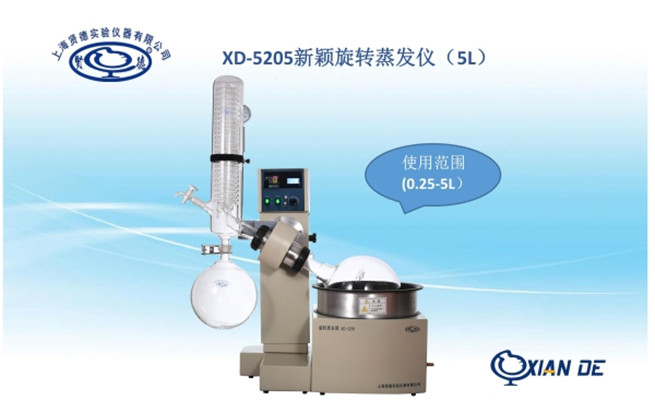 XD-5205型旋转蒸发器,主要金属件采用不锈钢,防锈铝合金,结构紧凑,外观精美,经久耐用,实用性强;密封系统采用氟胶+双重PTEF进口材料与玻璃转轴组合,不掉渣,耐磨延长了使用寿命;XD-5205型水浴锅,温度范围为:室温-99℃。温度高于设定温度加热管自动停止加热。设计配有真空表及阀门(防止真空泵内液体反冲到旋转蒸发器玻璃容器中,让实验一次性成功)。