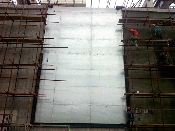 5.安装内侧单面:1200×2400×10mm泄爆板,板采用自攻丝固定于龙骨上,固定间距200mm,在板与每一个龙骨相接的地方都要固定