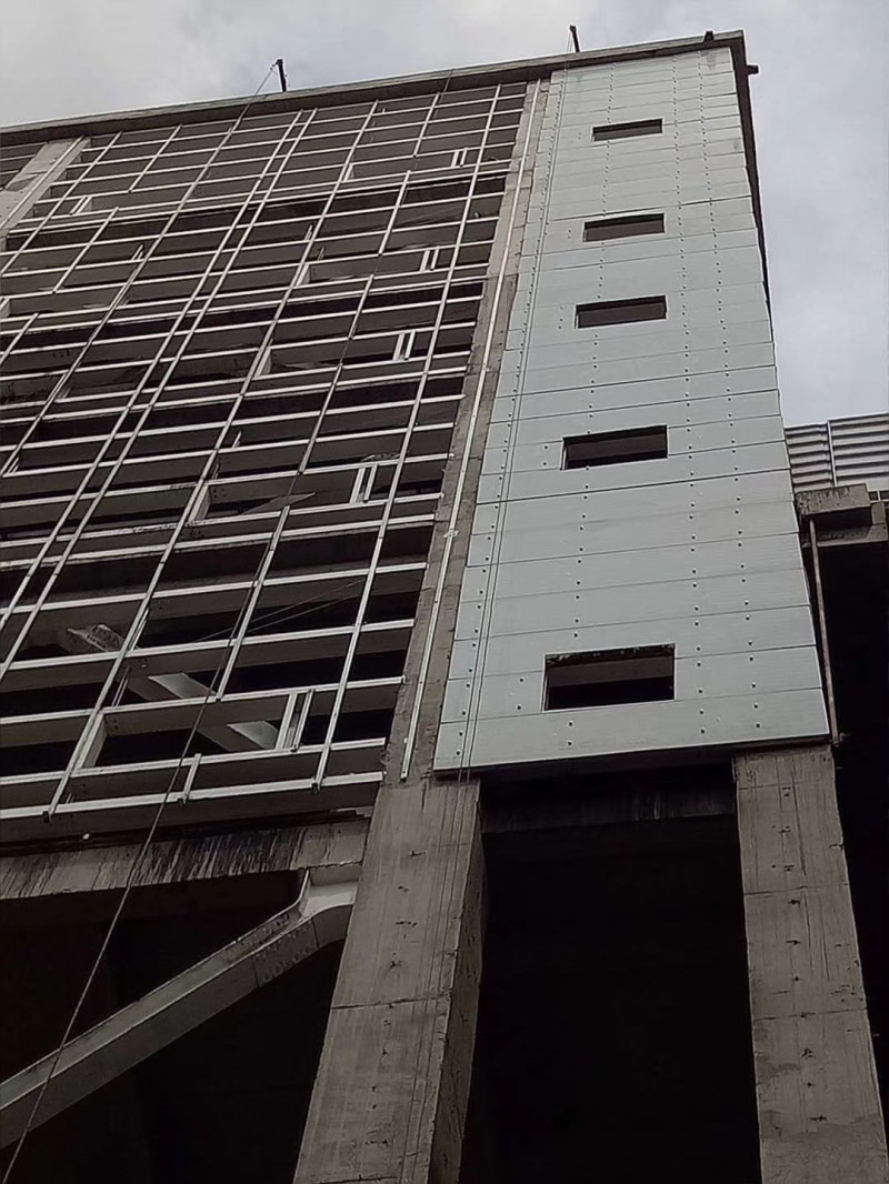 5.安装内侧单面:1200×2400×10mm泄爆板,板采用自攻丝固定于龙骨上,固定间距200mm,在板与每一个龙骨相接的地方都要固定