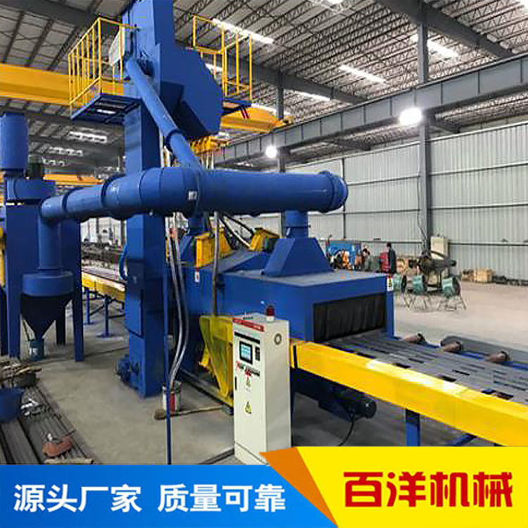 辊道通过式抛丸清理机是将工件吊放在输送辊道上,辊道输送系统将工件向前输送,当工件进入清理室时,抛丸器开始顺序工作。经过抛丸处理后,钢材表面的氧化皮、污物及其它附着物被清理干净,处理过的表面可达Sa2-2.5级。抛丸机的工作方式是连续循环进行的。