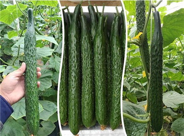 耐炎17,该品种株型紧凑,长势强,龙头大,叶片中等,节间适中,主蔓结瓜,瓜码密,连续结瓜能力强,不歇秧,产量高。瓜条长度 36 厘米左右,短把,密刺,颜色黑亮,顺直,整齐,瓜条性状稳定。