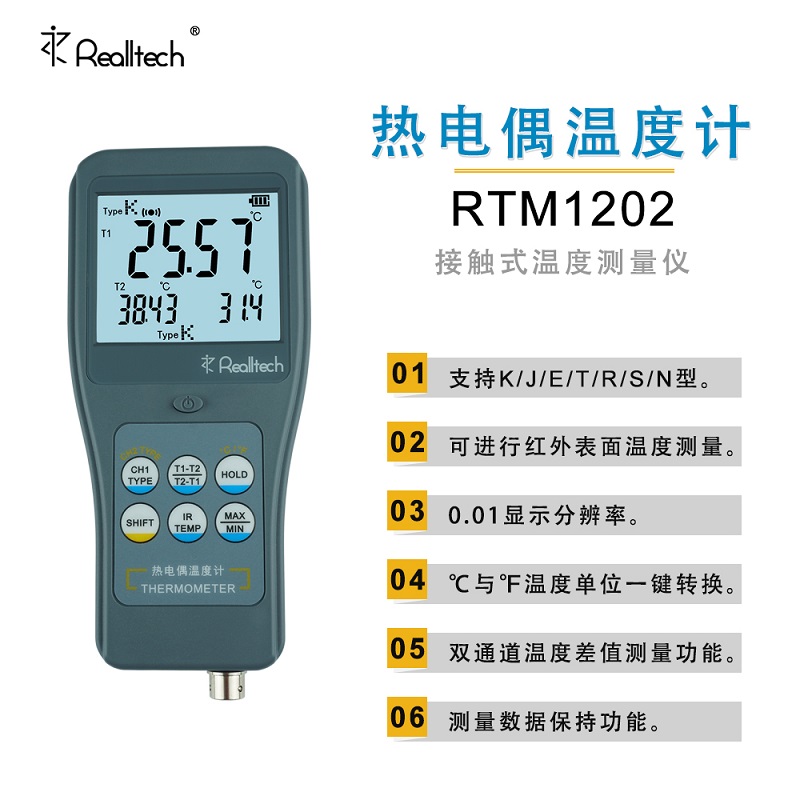 • 可选择不同的热电偶类型 (E/J/K/N/R/S/T) 进行温度测量,以满足不同行业的需求。