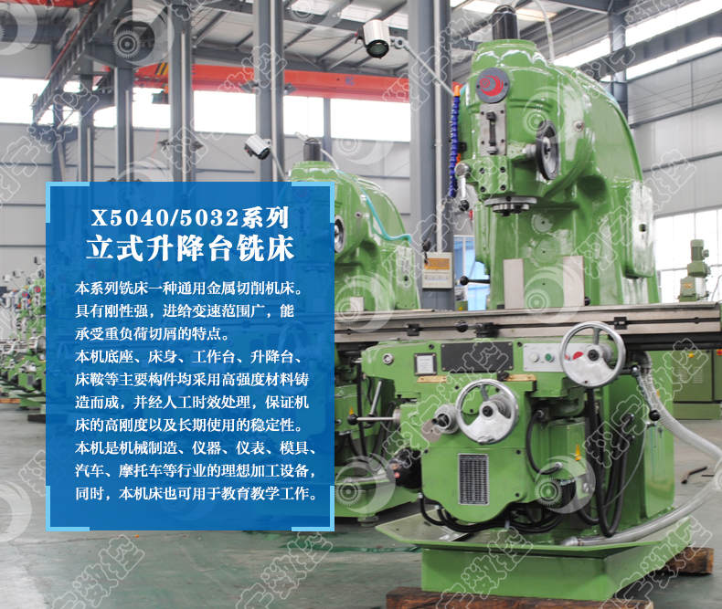 本产品具有刚性强,进给变速范围广,能承受重负荷切屑的特点。可直接或通过附件安装各种圆柱铣刀、角度铣刀以及端面铣刀来铣削平面、斜面、沟槽、孔等,如果装上分度头的同时,把分度头的传动轴与工作台的纵向丝杠挂轮架联系起来,也可以铣切螺旋面、铣切凸轮及弧形槽。