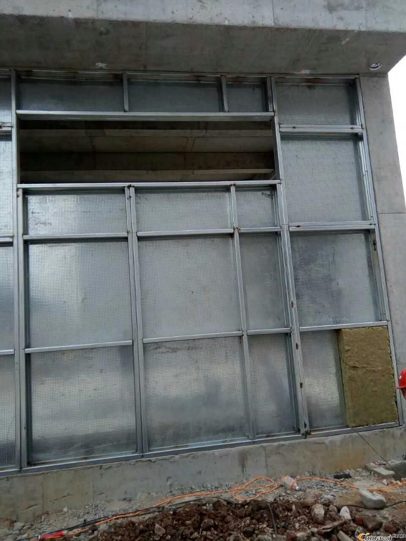 在所述型钢横梁上连接有U型龙骨,并且两根型钢横梁上的U型龙骨的U型开口相对,在两根型钢立柱之间安有至少一根与型钢立柱平行的C型轻钢龙骨,C型轻钢龙骨的上下两端与上下两根U型龙骨相连。