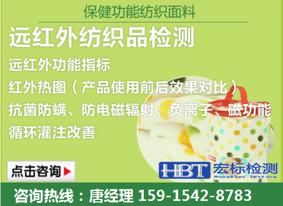 宏标检测提供材料、纺织品及电子电器产品方面的检测,包括负离子、远红外、磁功能测试鉴定及相关理化性能检测,更多详情可以咨询在线客服或者拨打免费咨询电话:159-1542-8783唐经理!