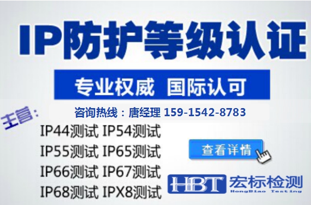 深圳市宏标检测认证有限公司 对各类产品的外壳防护等级进行合格评定性判定试验;最高检测等级IP68。常规产品检测等级包括:IP23、IP44、IP54、IP55、IP65、IP66、IP67、IP68等级。为您出具有中国认可国际互认资质CNAS、ilac-MRA标志的权威报告.在产品的研发、品质的鉴定、市场的拓展等方面发挥重要的作用,让客人不再置疑产品质量,只需要做一次检测,报告将无期限使用。
