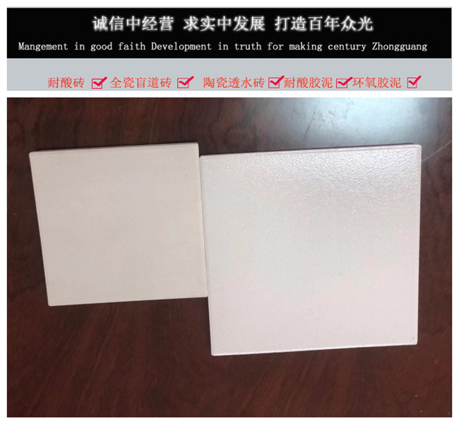 一般环氧树脂,耐酸胶泥、耐酸水泥铺贴,铺贴时可根据上述生产厂家产品使用说明书进行施工; 用草酸清洗混凝土表面,达到酸碱中和; 工业瓷耐酸砖,间缝宽度约8—10mm,间缝深度与砖厚相平为宜,以防泄露; 铺贴完毕后应用槽酸冲刷表面,以助于更加牢固。