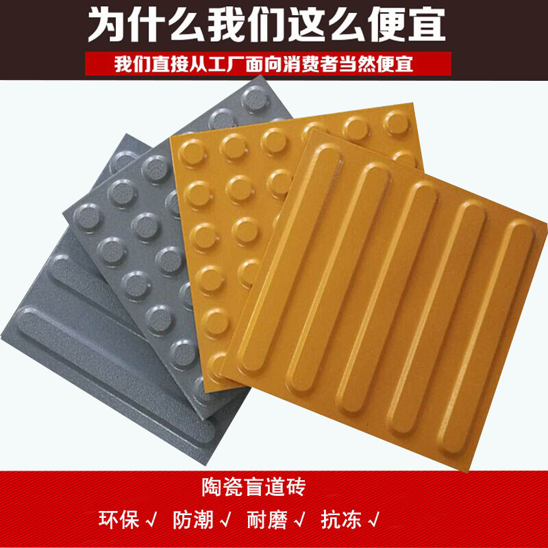 陶瓷盲道砖的基本信息:盲道砖主要是为盲人设计的地砖,方面盲人盲人出行,防止走错路发生危险。众光盲道砖材质:陶瓷,产品的图案类型有圆点与条形两种。常规颜色有 黄 灰 绿,其他颜色可订做起订量为1000平方米(11000片)以上。陶瓷盲道砖的规格;300*300*20 300*300*25 400*400*20,陶瓷烧制而成的盲人砖品质高,是绿色环保产品,无放射污染、美观大方。具有耐磨度高、抗低温、抗冲击、使用寿命长等特点。适用于各种公共场所,如各种人行道口、城市广场入口、公交候车站、建筑入口、地铁、高铁、公园等各种市政工程。