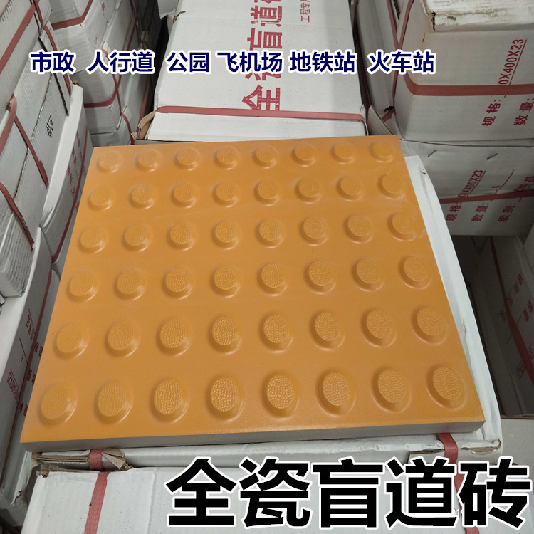 全瓷盲道砖密度大,强度较高,高温烧制,瓷化度高,使用寿命长,比较环保,国家已经在大力推广。此类盲道砖产品多是用在高铁、地铁、残联学校、社会福利院、养老院以及中高档小区的道路交通辅助设施。该款盲道砖产品规格整齐划一,误差小,与混凝土粘接力强,容易施工。
