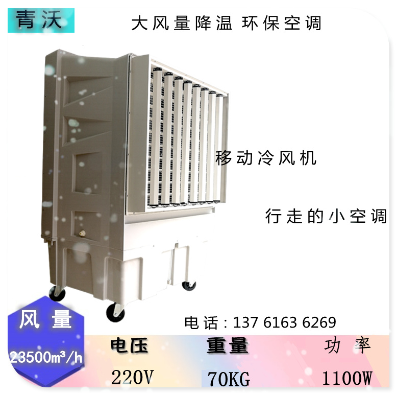 移动式冷风机又叫水蒸发节能环保空调机,是一种新型节能环保冷气机,由湿帘纸、水循环系统、送风机组成。具有降温效果明显,节能环保,安装简单、运行可靠等优点,可直接输送自然风及降温后的凉风。移动式冷风机(环保空调),出厂就是整机,工业冷风机移动空调,打开包装就能用,无需费时费力安装,工业冷风机厂家,没有墙外悬挂的危险性,真正实现标准化生产及应用。广泛适用于工厂车间、网吧、食堂餐厅、酒店厨房、员工宿舍、户外工作、休闲餐饮、办公室、门面、仓库等各种需要降温通风的场所。特别适合固定工位降温、流动性工作岗位降温、设备检修流动降温、仓储搬运工作降温、室外临时工作降温等需要移动使用的场所,是风扇的替代产品。