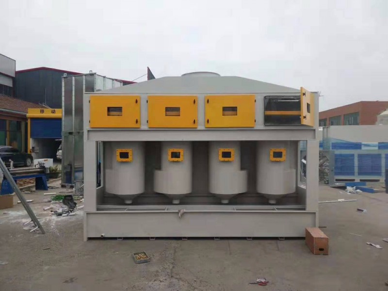 当生产作业时,烟尘废气在风机牵引力的作用下进入高速混流导轨装置,烟尘废气在离心力的作用下进行气液乳化反应,在混流液的高速旋转状态下,烟尘废气与旋转液体充分混合吸收相溶增加烟尘比重,利用旋流装置设计好的离心力达到气液分离,分离后的气体进入环保填料吸附层,由于气流切向进入设备呈横向圆周运动,避免了旋流类设备纵向运动导致填料堵塞的故障现象!在填料层的上端,螺旋喷头喷出的对应溶剂均匀分布在填料上,由于填料的合理设计,烟尘废气浸透在填料的时间较长,废气与反应液在专用环保填料表面有充分的气液相溶反应时间,从而达到达标排放的目的。
