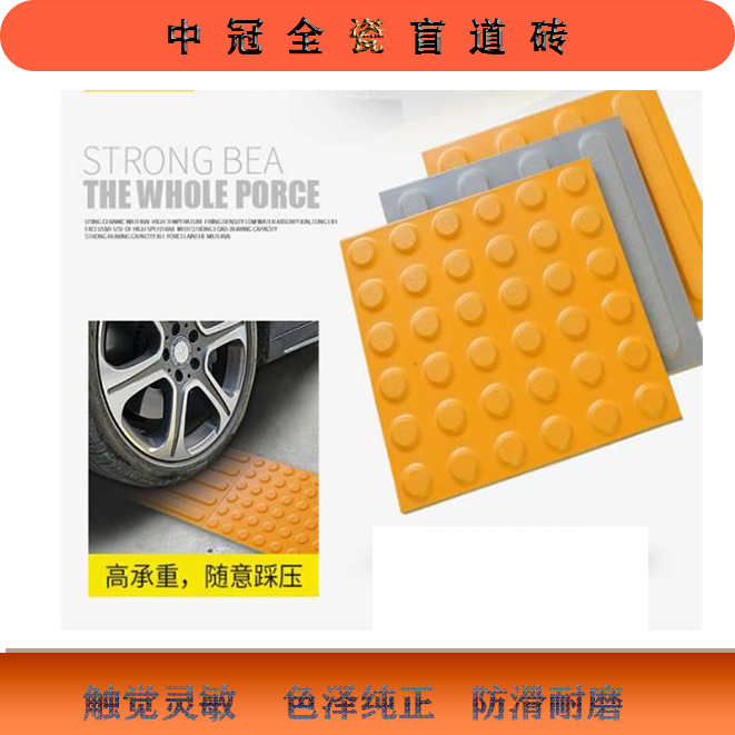【中冠全瓷盲道砖】是按照国际残联的相关标准制造,设计优良,具有灵敏的触觉感,强腐蚀,耐损耗性和长寿命等特征。这种高强盲道砖的表面既美丽又光滑,适用于高铁、地铁站台和室内及室外装修。它凹凸的模型不仅可以使盲道更加安全,同时还美化环境作用。