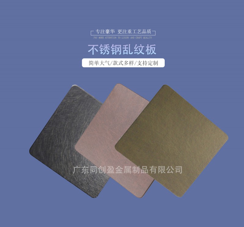 不锈钢乱纹板也叫震动纹或乱纹板,通过机器对不锈钢表面不断的压力研磨,形成不规则的横向短弯丝.加工过的和纹板与普通板板面不同,整体的的表面耐磨、抗刻划、耐磨擦性也超越于其它钢铁.不锈钢乱纹板其表面抗指纹效果远高于普通不锈钢.广泛应用于:豪华门、电梯板、户外工程、广告铭牌、家具、厨柜天花、走道板、屏风、隧道工程、外墙酒店大堂、门面以及各种不锈钢系列产品. 可上颜色,也可做花纹.供客户选择的颜色有: 钛黑(黑钛)、钛金、钛白、天蓝、宝石蓝、咖啡色、茶色、紫色、古铜、青古铜、香槟金、玫瑰金、紫红、绿色等。
