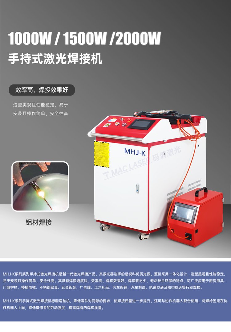 MHJ-K系列手持式激光焊接机是新一代激光焊接产品,其激光器选择的锐科优质光源,整机采用一体化设计,造型美观且性能稳定,易于安装且操作简单,安全性高,其具有焊接速度快、效率高,焊接效果好,焊接耗材少,寿命长且环保的特点,可广泛应用于厨房用具、门窗护栏、楼梯电梯、不锈钢家具、五金钣金、广告牌、工艺礼品、汽车修理、汽车制造、轨道交通及航空航天等行业焊接。