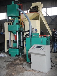 钢屑压块机的结构特征:由上下横梁、液压缸总成、加料缸、模具、料斗、充液总成等组成,上下横梁由立柱和螺母联接,主液压缸前端用法兰联接在横梁底部,模具固定在下横梁上,模套固定在模具内,冲头直接联接在油缸活塞杆顶端,模套和冲头均可拆卸和更换,有一抽板缸位于主机下模具后面,抽板缸前位时与模套形成模腔底部,后位时底部形成空间,利于饼块落下,同时具有推饼出模具底部的功能。加料缸和加料斗组成自动加料机构,机器的加料由加料缸的往复动作完成,充液系统位于横梁侧面,以补充主油缸快速前进所需的油液。
