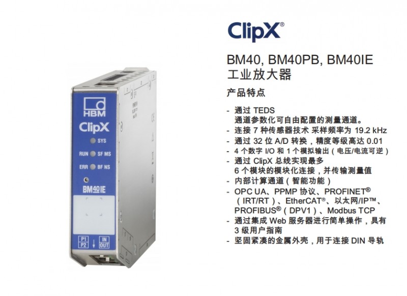 BM40, BM40PB, BM40IE---- 4 -- TEDS 7 32 A/D I/O ! 1 ClipX ()*+, 6 ".". 。 19.2 kHz , 0.01 "#$(%&/%') ,/$ 01 (233)- OPC UA、PPMP 45、PROFINET® (IRT/RT)、EtherCAT®、67/IP™、 PROFIBUS®(DPV1)、Modbus TCP 8 Web 9 3 @ABC- DEF :;<=>,? GHI,@ DIN JK---- 4 -- TEDS 7 32 A/D I/O ! 1 ClipX ()*+, 6 ".". 。 19.2 kHz , 0.01 "#$(%&/%') ,/$ 01 (233)- OPC UA、PPMP 45、PROFINET® (IRT/RT)、EtherCAT®、67/IP™、 PROFIBUS®(DPV1)、Modbus TCP 8 Web 9 3 @ABC- DEF :;<=>,? GHI,@ DIN JK ClipX NO P BM40, BM40PB, BM40IE $ 1, 、()、 、(Pt100)、(10 V)、 (20 mA) A/D 32,Delta-Sigma (△Σ) S/s 19200 QRS(-3dB)Hz(DC): 3800Hz (CF):200Hz ?T UV Hz !" # 6 ,IIR DC:0.02 … 3000;(3800) CF:0.02 … 200 W $% TEDS &,' m TEDS,IEEE 1451.4 TEDS TEDS 100 %T%&XY VDC 10 … 30((()) 24 V) %T%&Z (* PLC (+ DIN EN 61131-2) 24 V(-10 %) 12 V(-10 %) ms ms 10 1 24 V %T%& ,,' W 5 %[\ V 60 -、.、ClipX 、、/0 .,1 PROFIBUS 2 3 %] 4 5 /0. ./,3 60 78,, 9: 78 ;<,=。 67(>)10base‐T / 100base‐TX ? /@A TCP/IP( IP BA! DHCP) ;< RJ45,8 C (+ LAN、CAT5、SFTP D' m 100 ClipX ()(L$) D,' 6 > 1 E>F(F、F) kHz 1,604 , ? /@A RS485, 1 … 6 ,GHIJK 2 &,' cm 30