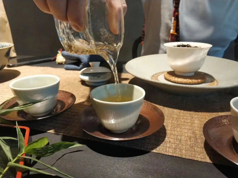 就在我沉浸在茶香中时,不远处传来了一阵喝彩声。原来是茶艺师开始表演长嘴壶茶艺了。只见她身穿红色旗袍,手持长嘴铜壶,动作轻盈流畅,壶嘴在她的手中、两侧、后背、头上转来转去,时而高高抛起,时而低空划过,最后稳稳地将茶水注入茶碗中,整套动作一气呵成,令人叹为观止。