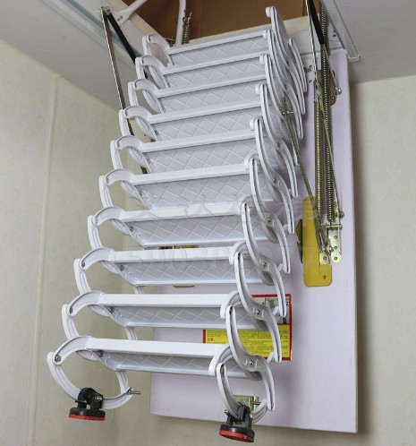 阁楼伸缩楼梯适合空间小的阁楼使用,不用的时候可以收起来,门板盖上,不影响下面的空间利用。非常节约空间。