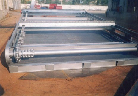 设备主要由机架、传动机构、清渣板刷、拦污网篦、清理刷等部件组成。当水流通过网篦时水中的污染物被截流,清渣板刷在链条的牵引下由下向上清扫网篦表面的污物,到达池底后卸渣,少量附着在板刷上的污物被转动圆毛刷清除掉。