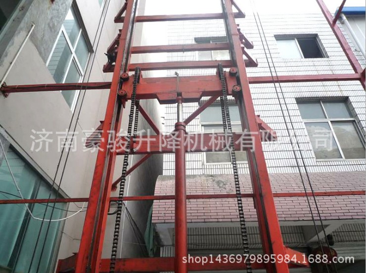 160*80*5mm、200*100*6mm等规格的锰钢矩管,升降机台面使用山东济南三塑集团生产的防滑塑料绝缘板、防滑花纹钢板,升降机设备上升速度一般在4-6米/分钟,下降时速度可根据实际使用条件进行调整,济南豪骏升降机械生产的升降机使用“德力西牌”控制器配合电动液压一起完成上升与下降作业,控制电压在24V,配套动力根据升降机设备的载重重量分别为1.5kw、2.2kw、3.0kw、4.0kw、5.0kw、7.5kw等,电机电源可分别使用单相电220v或三相电380v。
