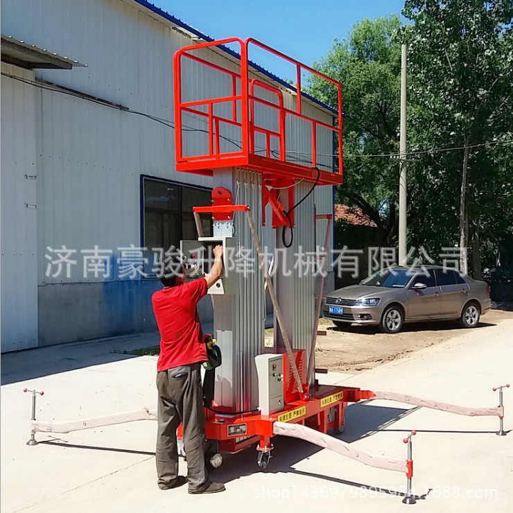 铝合金升降平台分为单柱式、双柱式、三柱式升降机及多柱式等。升高高度在8米以下为单跪柱式,在10米到14米之间为双跪柱式,15米到18米之间则升为三跪柱式或四跪柱式。通过铝合金跪柱的增加达到设备在高空的稳定性,保证作业安全,减小设备晃动的幅度,使高空作业更加平稳。整体采用高强度铝型材精制而成,由于型材强度高,同样也使升降机的台面偏转与摆动极小。该升降机配备了中德合资的液压泵站,该泵站为压铸铝集成阀块,结构紧凑,系统压力 16MPa,选用进口密封件的精磨高压液压油缸作为主要升降动力,经过液压泵站带动链条传动,结构合理,设计紧凑。该升降机下降速度可自调,而且设备设有手动下降装置,保证在停电时的正常工作;设有应急停运按钮;台面设有防滑绝缘扣板,更换方便,易于清洁,维修方便,有效保障工作安全可靠,保证使用人员的绝对安全。外形美观,整体轻盈,能在极小的空间内发挥最高的举升功能,广泛适用于工厂、酒店、宾馆、商场、超市、体育场、车站、电厂等电力线路、照明电器、高架管道等安装维护,高空清洁。可根据客户要求加装蓄电池以满足客户工作场地的不同要求。