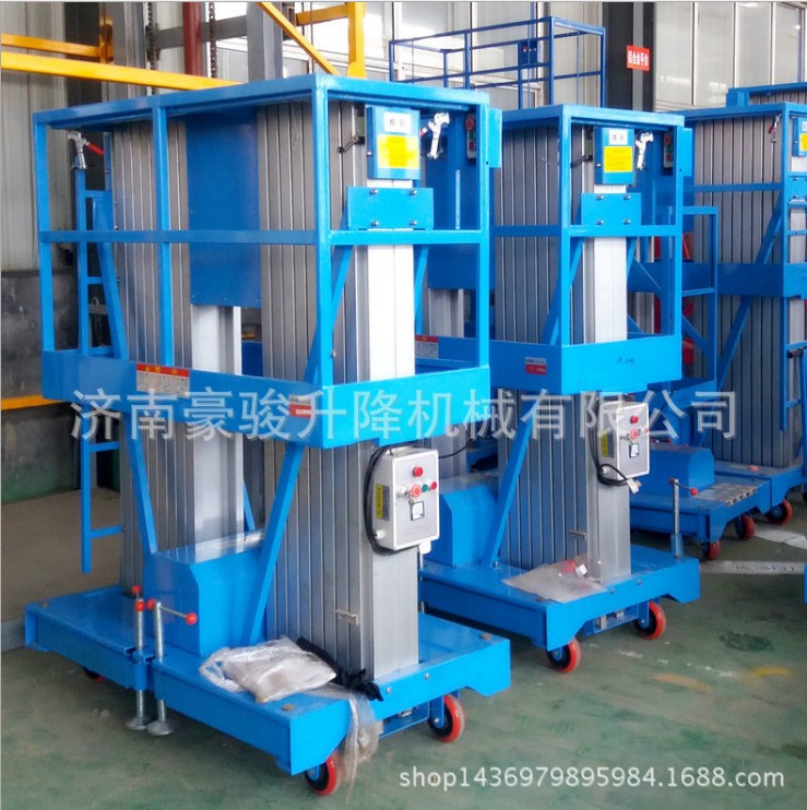 铝合金升降平台分为单柱式、双柱式、三柱式升降机及多柱式等。升高高度在8米以下为单跪柱式,在10米到14米之间为双跪柱式,15米到18米之间则升为三跪柱式或四跪柱式。通过铝合金跪柱的增加达到设备在高空的稳定性,保证作业安全,减小设备晃动的幅度,使高空作业更加平稳。整体采用高强度铝型材精制而成,由于型材强度高,同样也使升降机的台面偏转与摆动极小。该升降机配备了中德合资的液压泵站,该泵站为压铸铝集成阀块,结构紧凑,系统压力 16MPa,选用进口密封件的精磨高压液压油缸作为主要升降动力,经过液压泵站带动链条传动,结构合理,设计紧凑。该升降机下降速度可自调,而且设备设有手动下降装置,保证在停电时的正常工作;设有应急停运按钮;台面设有防滑绝缘扣板,更换方便,易于清洁,维修方便,有效保障工作安全可靠,保证使用人员的绝对安全。外形美观,整体轻盈,能在极小的空间内发挥最高的举升功能,广泛适用于工厂、酒店、宾馆、商场、超市、体育场、车站、电厂等电力线路、照明电器、高架管道等安装维护,高空清洁。可根据客户要求加装蓄电池以满足客户工作场地的不同要求。