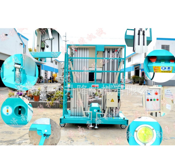 四立柱铝合金升降机: 整体采取高强度铝型材精制而成因为型材强度高,采取四桅柱式构造,稳定性极好,运转灵巧,载分量大,平台面积大,推行方便。它轻巧的外观,能在极小的空间内施展最高的举升才能。使升降台的偏转与摆动极小。该升降机普遍用于厂房、宾馆、大厦、商场、车站、机场、体育场等。可用作电力线路、照明电器、高架管道等安装保护,地面清洁等单人任务的地面作业。