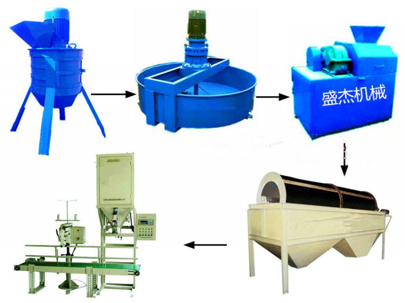 简介复合肥生产线的工艺流程通常可分为:原料配料、原料搅拌、原料造粒、颗粒烘干、颗粒冷却、颗粒分级、成品包膜、最后成品包装
