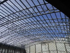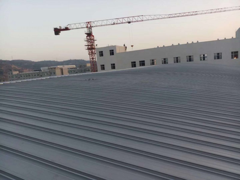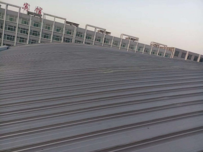 占地面积3800平米,屋面为拱形结构,板长35.4米,自然下垂。900型冲孔板为底板,中间加60mm厚岩棉保温,屋面板为1.0mm厚65-430型铝镁锰板。每跨两块65-430型阳光板作为采光窗。现场压板工期30天。