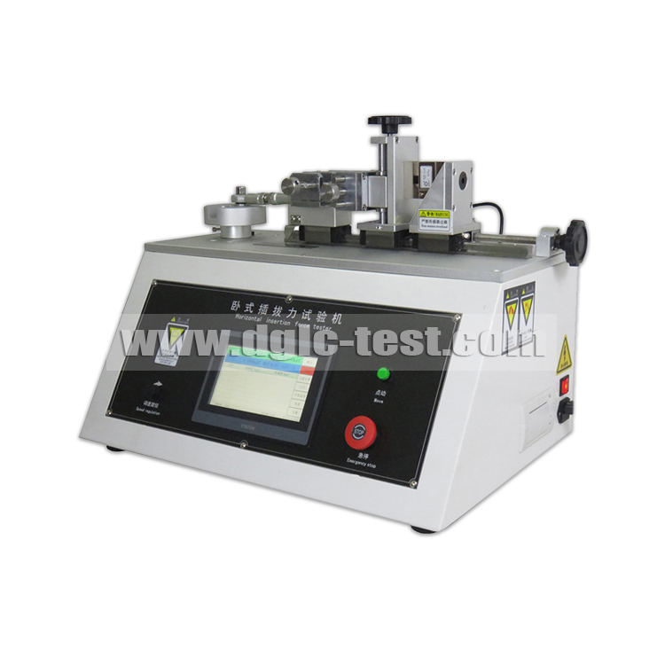 触摸屏卧式插拔力试验机适用于各种连接器之压缩、拉伸破坏试验, 连接器单孔插拔试验, 连接器整排插拔试验, 连接器插拔寿命试验, 连接器单针与塑胶保持力试验,可显示插拔力连续变化值和峰值,插拔力试验机具有次数设定,插拔力试验机速度行程可调,插拔力试验机显示速度值,并可打印测试结果。