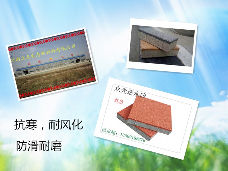 上海透水砖,陶瓷颗粒透水砖,透水砖图片,透水砖规格请联系z业的透水砖厂家:河南众光生态新材料有限公司,河南众光生态新材料有限公司坐落于河南省焦作市修武县境内——云台山脚下,公司总投资10亿元人民币,占地600亩,一期投资3亿元人民币,占地300亩,投资建设年产150万平方米生态陶瓷透水砖生产线,是集科研、开发、生产为一体,是目前*内z业生产研发生态陶瓷透水砖的大型*科技企业。