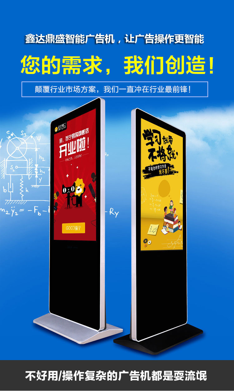 广告机是新一代的智能设备,通过终端软件控制、网络信息传输和多媒体终端显示构成一个完整的广告播控