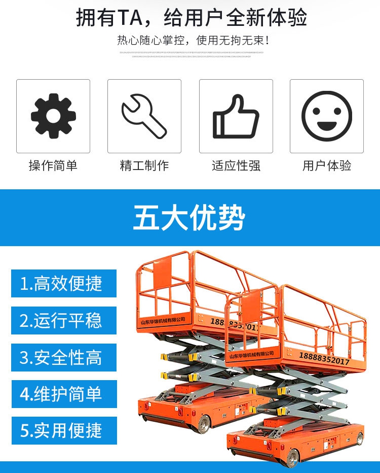 3、自行式液压升降平台是一种自动行走、自动升降的液压升降设备,具有体积小、自动化程度高、运行灵活方便、安全可靠、操作简单、外形美观等特点。