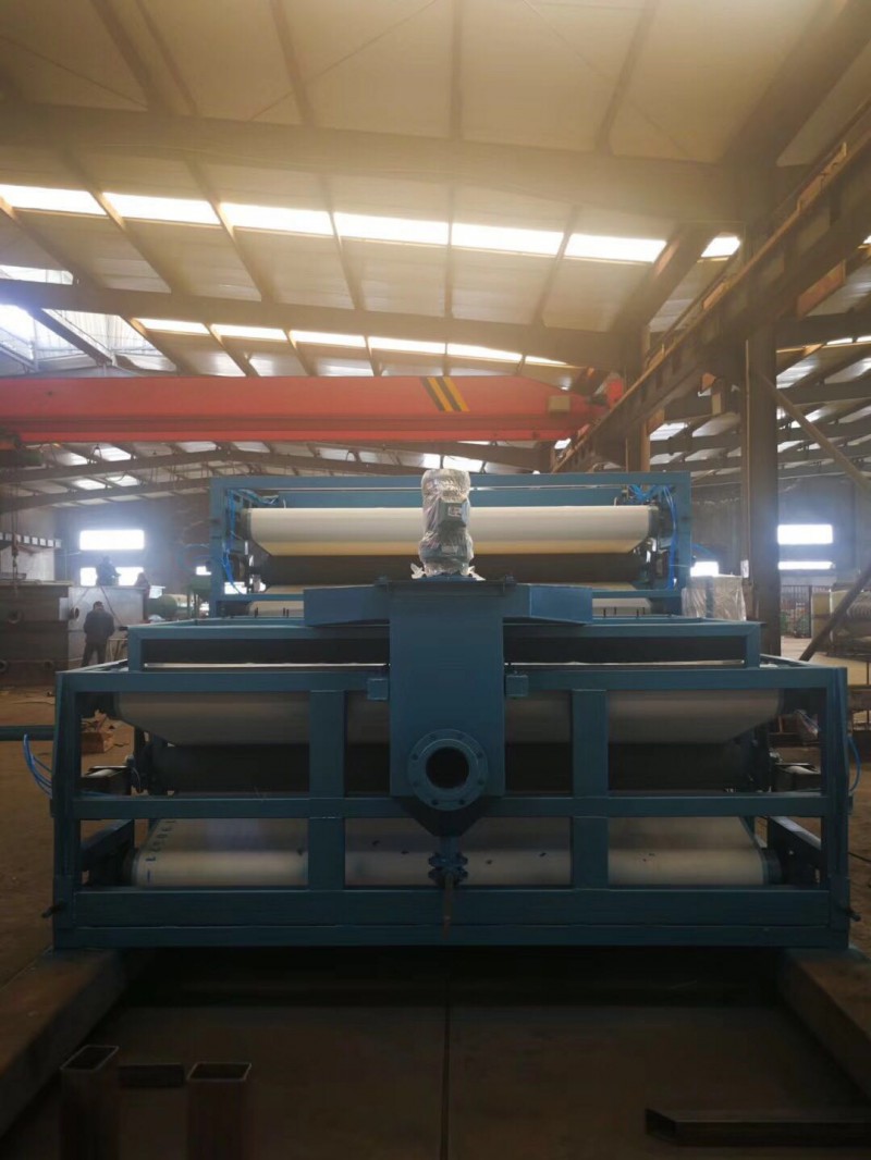 该系列压滤机由导向导辊,压榨辊和上下滤带及滤带张紧、纠偏、冲洗、调整等装置组成。其压榨辊呈S状布置,并且压榨辊直径由大而小排列,使滤带与压榨辊接触面大,压榨时间长,污水受到的压力较小而缓合。上下滤带以相同方向,相同速度运行,靠滤带的张力产生对污泥的压力和剪切力把污泥中的毛细水挤压出去,达到污泥脱水之目的。IMG_20190412_083640