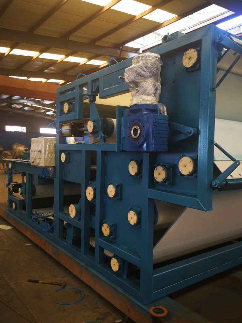 该系列压滤机由导向导辊,压榨辊和上下滤带及滤带张紧、纠偏、冲洗、调整等装置组成。其压榨辊呈S状布置,并且压榨辊直径由大而小排列,使滤带与压榨辊接触面大,压榨时间长,污水受到的压力较小而缓合。上下滤带以相同方向,相同速度运行,靠滤带的张力产生对污泥的压力和剪切力把污泥中的毛细水挤压出去,达到污泥脱水之目的。IMG_20190412_083640