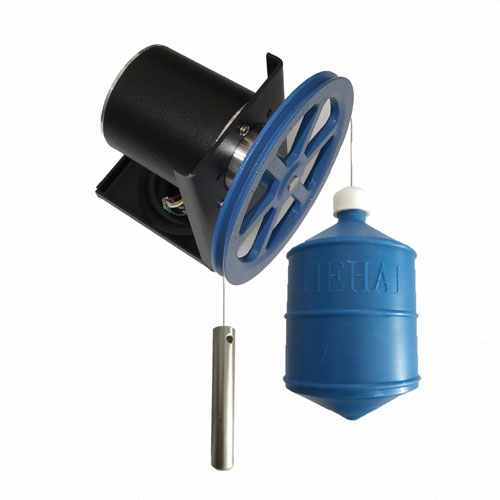 其工作原理就是:水位传感器测轮安装在编码器输入轴上,钢丝绳一端连接浮子、另一端连接重锤,钢丝绳绕在测轮上。当液位发生变化时浮子随液位的变化而升降,钢丝绳带动测轮转动,编码器输出相应的实时水位值。
