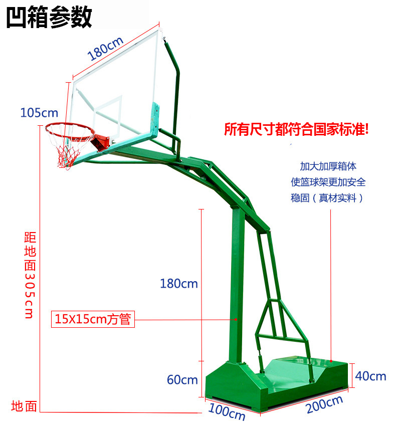 产品介绍:平箱篮球架:和凹箱一样,它的结构是平整的箱体,从结构上来说,要比凹箱的稳定性好上一些,配重能达到400公斤以上。此款篮球架有含滚轮的,也有伪移动的款式,在购买前需要先了解清楚。价格在5000-9000元不等,基它数据和凹箱一致。像前几天济南刮风吹走篮球架的新闻里的篮球架就是带滚轮的平箱可移动式篮球架,由于篮球架底部的滚轮不可以收缩,所以,在安装是需要将轮子想办法固定好,以免出现危险。