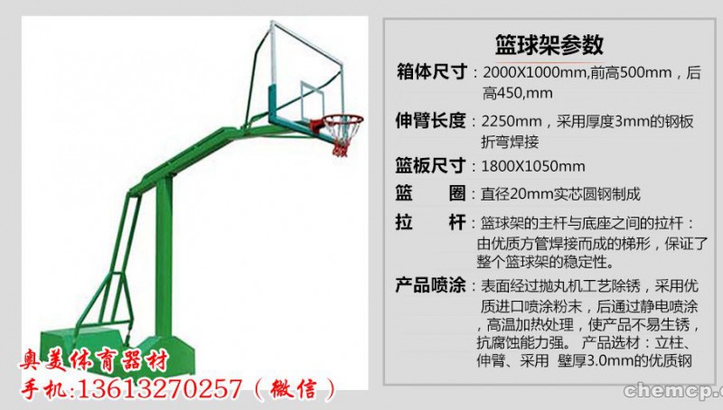 产品介绍:仿液压篮球架:平箱篮球架的升级版,加入了一个小部件,可以使底部的滚轮升降,在固定时可以收缩,需要移动时可以伸出,大大方便了用户使用。此款箱体较大,配重能达到500公斤以上为佳,臂展也分为了2.25和1.85两种规格。价格区间在:8000-13000/副。同样篮板可按用户要求安装。