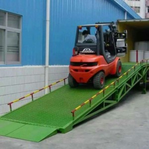 移动式登车桥:登车桥适用于仓储货台和邮政枢纽装卸,可根据货车车厢不同高度调节,即可调高也可调低,方便叉车驶入车厢,装卸自如,两侧设有防轧裙板,工作更加安全,叉车等搬运车辆通过登车桥直接进入货车内部进行货物的批量装卸,仅需单人作业,即可实现货物的快速装卸。它使企业减少大量的劳力,提高工作效应,获取 更大的经济效益。电动液压、操作简单、高度可任意调节、调节范围大、提高装卸效率、节省人力。