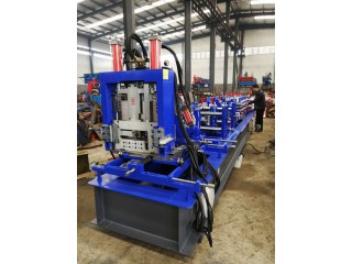 矫平机由板料导入装置、引板驱动辊、两侧可调的导向装置、矫平辊等组成。它由单独一个电机驱动,速度稍慢于主驱动电机,在减速机轴头安装超越离合器,开始装料时电机驱动上料;当工件送入主驱动辊后,由于超越离合器的作用,前驱动电机处于被动状态。当钢板被剪断后,由于主驱动电机比前驱动电机速度快,自然拉开一段距离;当一批工件加工完,钢卷需要中途退出时,前驱动电机停止,等前面的工件完全被送出成型辊后,前驱动电机反转退出钢卷。