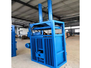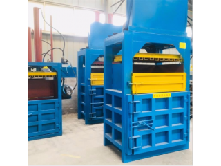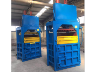 液压打包机包括支架,支架带有底板和前后侧挡板,支架上安装有千斤顶,千斤顶带有活塞杆,活塞杆右端连接有竖直的推料板,推料板右侧面连接有推料板条,相邻推料板条之间的空隙为板上穿绳槽;支架上面右部带有压料上挡板,压料上挡板左侧的支架上面带有进料口;前后侧挡板右侧的支架上分别固定连接有前后侧挡条,相邻侧挡条之间的空隙为穿绳口;支架右端带有出料口,出料口处的支架右端铰接有门板,门板左侧面连接有门板条,相邻门板条之间的空隙为门上穿绳槽;前后侧挡板、推料板和底板围成的空腔为进料腔,前后侧挡条、压料上挡板、门板和底板围成的空腔为挤料腔;门板和支架右端固定连接有锁定装置。并可根据需要在一定范围内调节打包的大小。