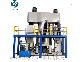 双行星动力混合搅拌机是在双行星混合搅拌机基础上加以创新改进开发出来的一种高性能、高效率、易清洗维护的新型搅拌设备。该设备的双组搅拌器自转的同时绕着轴心进行公转。搅拌器形式根据物料粘度和工艺特性选配,常见的包括桨叶式、麻花式、爪式、框式等,具备良好的混合、反应、捏合、溶解的作用。高速分散器由多层具备极高线速度的锯齿状分散盘组成,它同样在高速自转的同时绕着轴心进行公转,能够将粉料(助剂)快速的分散到浆料里,具备很强的分散作用。双行星动力混合搅拌机配有一组独立刮壁,对桶壁进行不断的刮拭,同时搅拌桨叶可以增加刮片,对料桶底部进行刮拭,避免搅拌死角,确保产品的稳定性。其传动采用行星轮传动,有较大的输出扭矩,适用于高温、高固、高粘等等高难度工况。该机密闭式设计,可以配合真空系统,实现真空搅拌,搅拌桶可设计带夹套加热,配合模温机,实现恒温搅拌功能,是市场上针对高粘度物料的混合分散、搅拌设备。