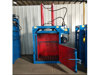 液压打包机包括支架,支架带有底板和前后侧挡板,支架上安装有千斤顶,千斤顶带有活塞杆,活塞杆右端连接有竖直的推料板,推料板右侧面连接有推料板条,相邻推料板条之间的空隙为板上穿绳槽;支架上面右部带有压料上挡板,压料上挡板左侧的支架上面带有进料口;前后侧挡板右侧的支架上分别固定连接有前后侧挡条,相邻侧挡条之间的空隙为穿绳口;支架右端带有出料口,出料口处的支架右端铰接有门板,门板左侧面连接有门板条,相邻门板条之间的空隙为门上穿绳槽;前后侧挡板、推料板和底板围成的空腔为进料腔,前后侧挡条、压料上挡板、门板和底板围成的空腔为挤料腔;门板和支架右端固定连接有锁定装置。并可根据需要在一定范围内调节打包的大小。