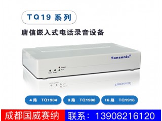 唐信TQ19系列嵌入式电话录音设备型号分别为TQ1904、TQ1908、TQ1916对应路数为 4路、8路、16路; 录音通道采用高阻并联连接方式,具有实时录音、实时监听、来电显示、操作日志、8倍压缩、未接记录、分机记录、自动增益、弹屏显示、邮箱报警、中央管理、FTP备份数据、智能客户端、WEB查询端、云储存等功能。出厂默认支持局域网内同时1个客户端(可增加客户端)进行监听、查听,方便管理人员不在服务器端进行监听管理,客户端只需输入录音服务器的IP地址即可在权限范围内监听及查询,操作简单;多种权限设置,细化管理级别;还有部门统计、断线告警、邮件短信通知、来电弹屏等强大功能。可广泛的应用于商业电话录音,电力调度录音,热线服务电话录音,投诉电话录音,关键岗位电话录音,金融证券录音,公安报警录音,安全部门的监听电话,航空、铁路、交通运输调度录音及各行业的生产调度录音。